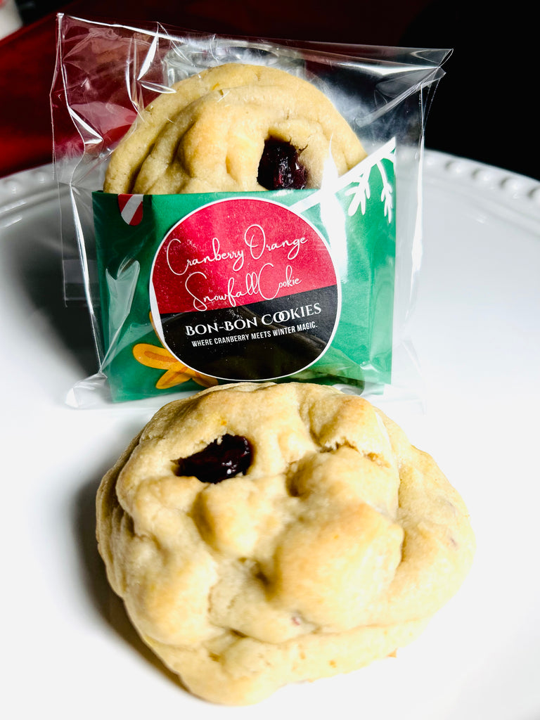 Our Cranberry Orange Snowfall Cookie is a soft, chewy, bakery-style cookie made with creamy white chocolate chips, tart dried cranberries, and fresh orange zest folded into a buttery vanilla dough. Lightly crisp on the edges with a tender center, this cookie delivers a bright, festive flavor in every bite.